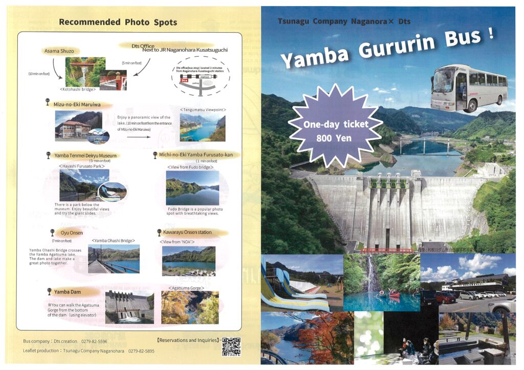 「町に導入されたぐるりん号を利用してもらい、多くの人に八ッ場観光に訪れてほしい!」という住民の声を形にするため、八ッ場あがつま湖周辺をぐるりんバスで巡るためのパンフレットをつなカンで作成しました。