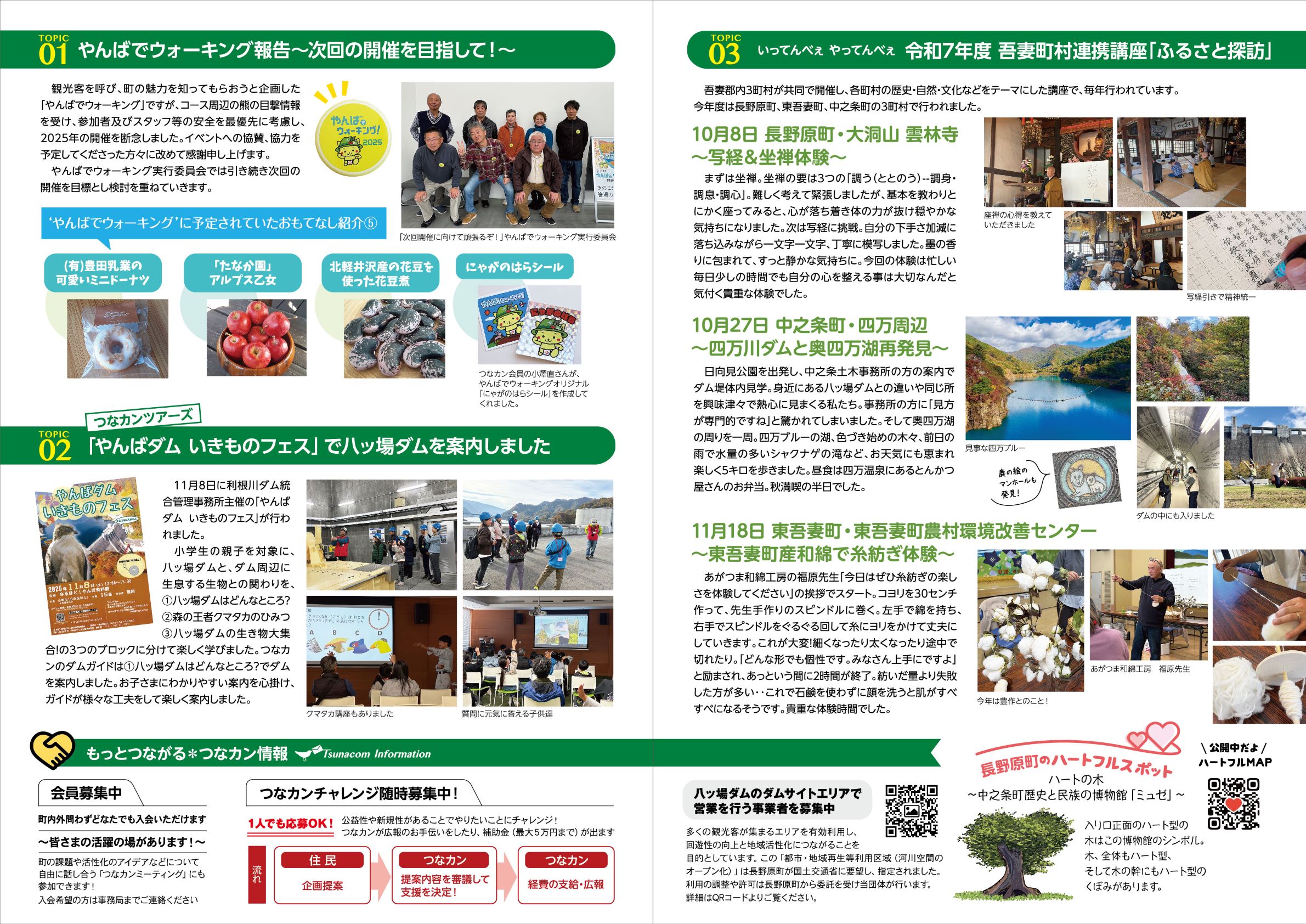 告知は、つなカン事業《ふるさと再発見企画》から「第4回 つなカン杯 〝長野原町かるた大会〟」。報告は、つなカン事業《ダムオープン化》から、「やんばでウォーキング」と、「やんばダムいきものフェス」に参加等です。