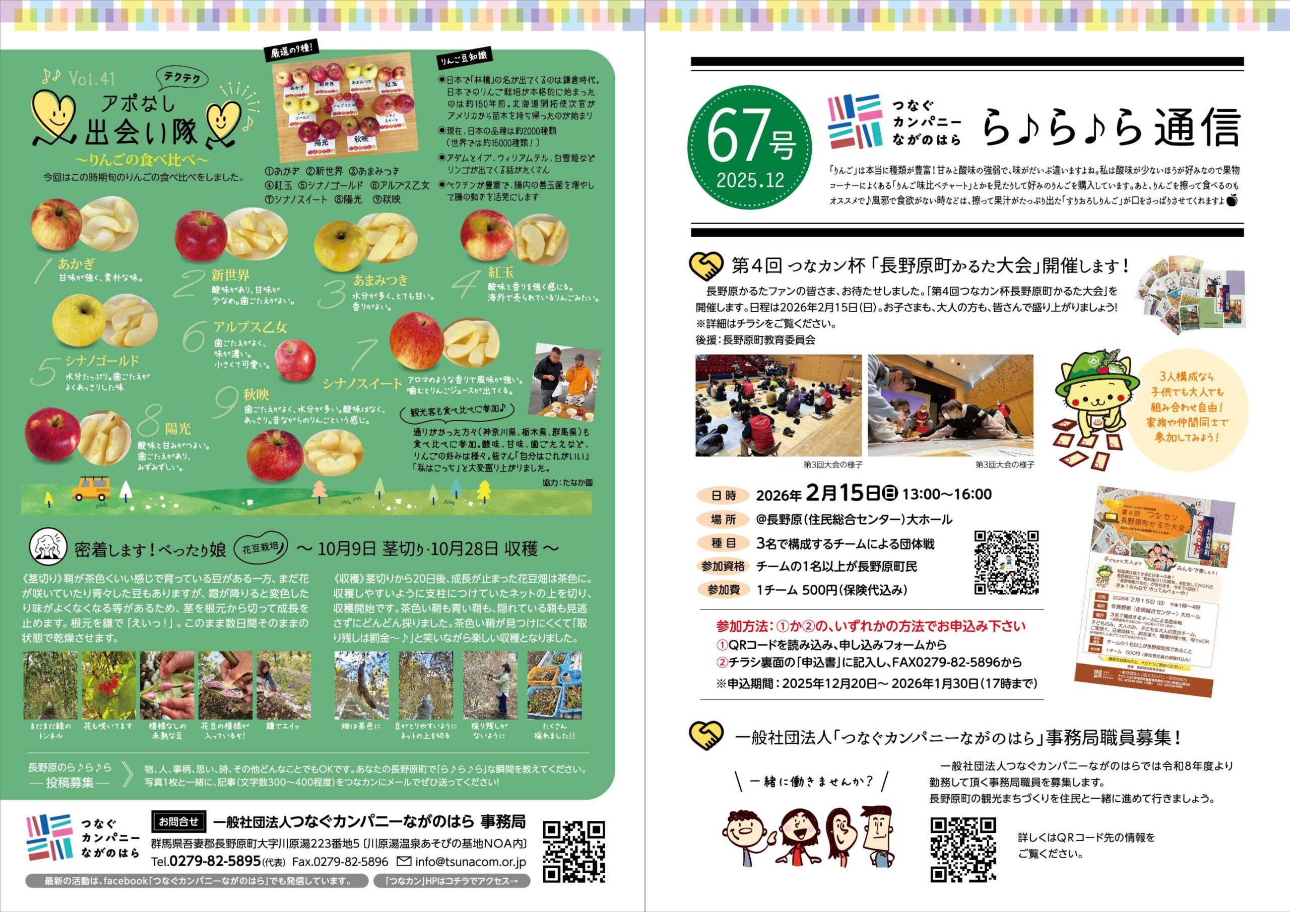 「つなカン」から皆さまへ、「つなカン」の活動や、町の魅力を「つなカン」目線でお届けする刊行物「ら♪ら♪ら通信」。第67号を12月9日より町内全戸配布しています。