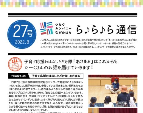 「つなカン」から皆さまへ、「つなカン」の活動や、町の魅力を「つなカン」目線でお届けする刊行物「ら♪ら♪ら通信」。第27号を8月9日より町内全戸配布しています。 活動報告は、7月末で、つなカンチャレンジ期間が終了する「子育