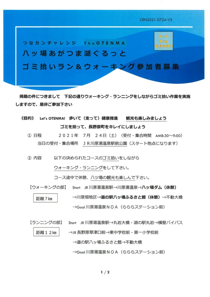 つなカン会員松本直幸さんのチャレンジ企画、ゴミ拾いイベントが7月24日(土)に八ッ場あがつま湖周辺で開催されます。